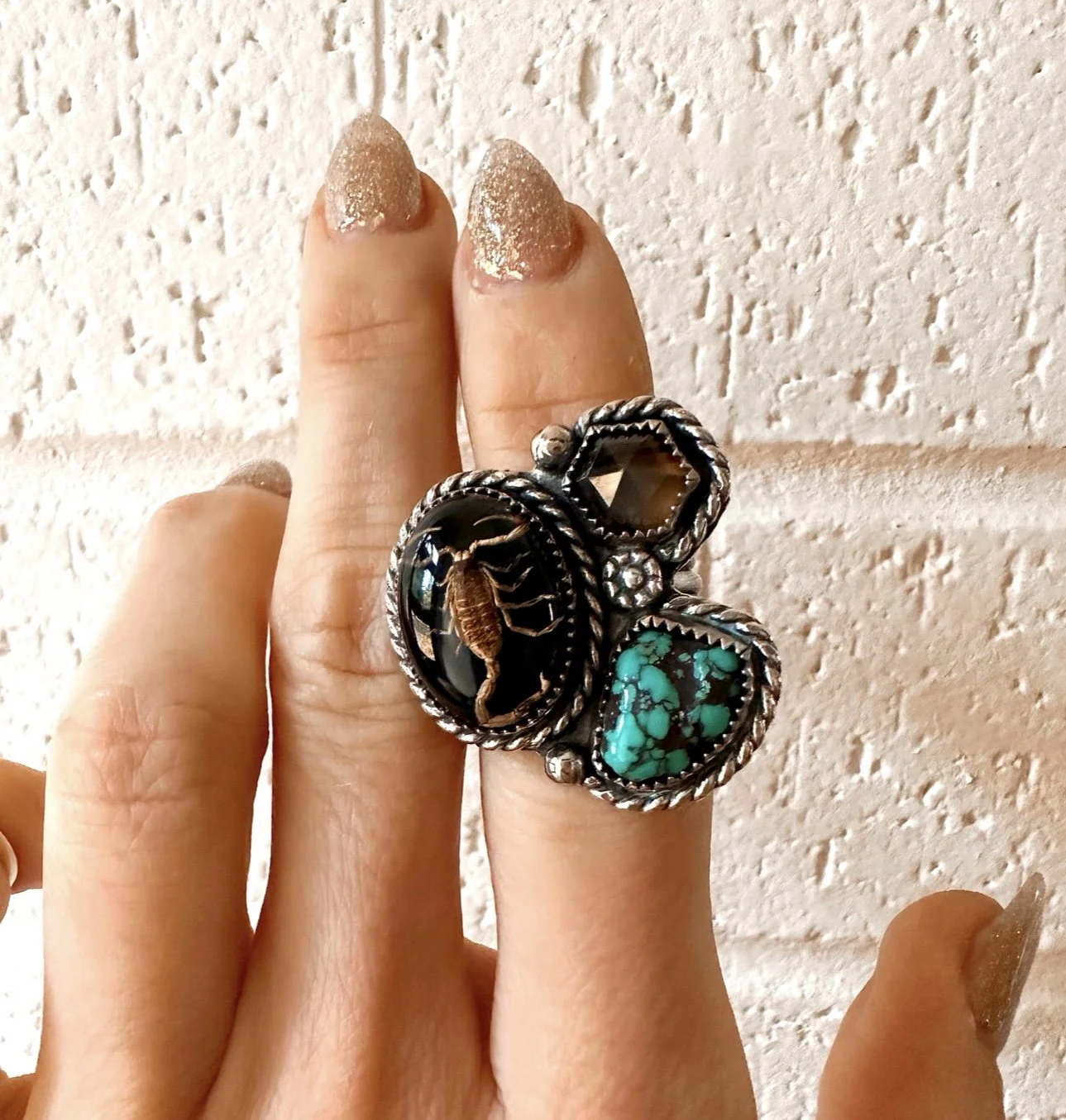 Sterling silver and real scorpion in black resin with Wild Horse Turquoise and Natural top Kingman Turquoise pieces with decorative floral center piece.