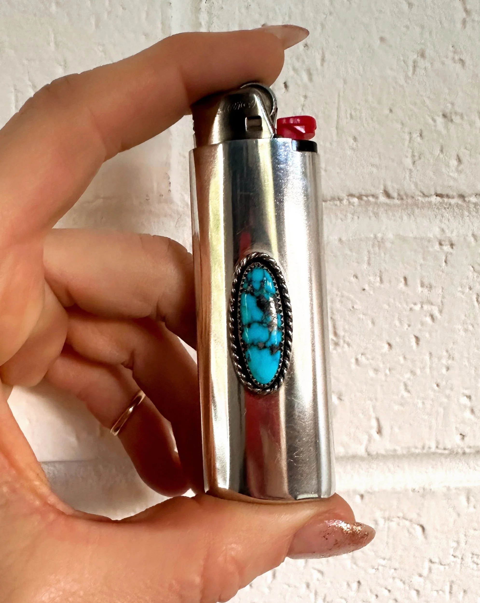 Solid sterling silver lighter with Kingman turquoise accent stone. Includes a full working lighter.