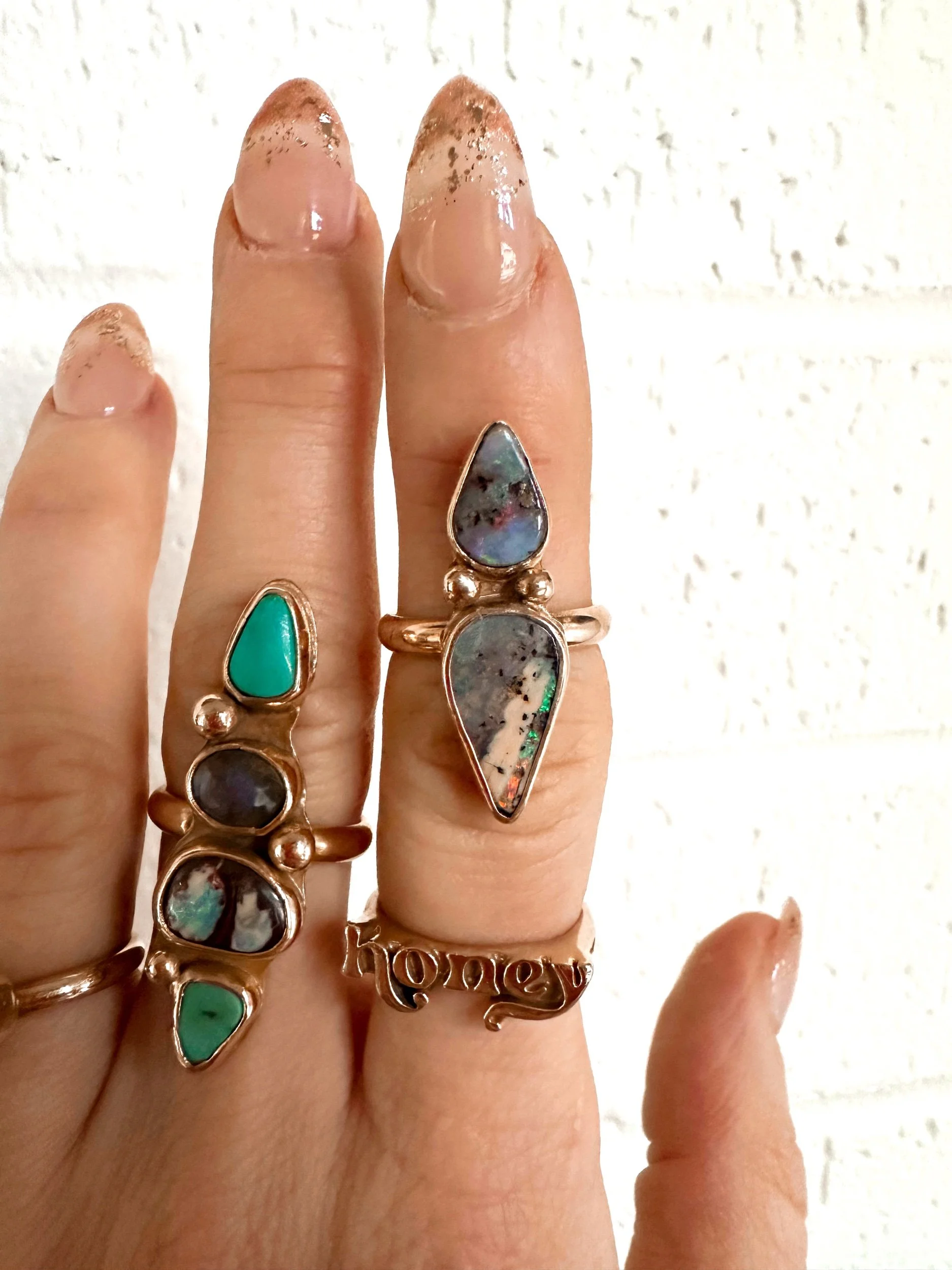 Image 1 of 1 Australian Boulder opal ring- Sz 6.5 $460.00 sold out Solid yellow 14k gold ring with matching set of Australian Boulder Opals. Size 6.5Handmade by Joelle Camino Sold Out Added! Solid yellow 14k gold ring with matching set of Australian Boulder Opals. Size 6.5Handmade by Joelle Camino