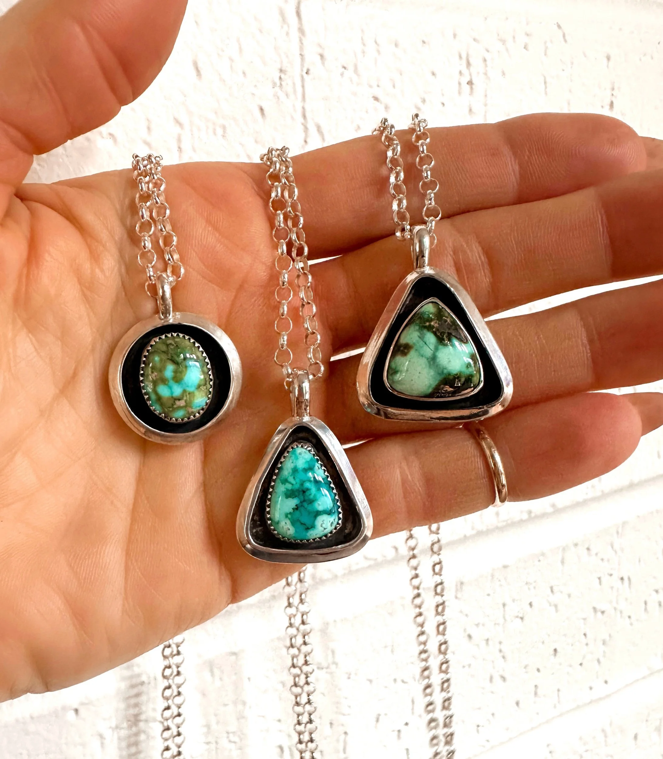 Image 1 of 5 Image 2 of 5 Image 3 of 5 Image 4 of 5 Image 5 of 5 Shadow Box Necklace $158.00 Sterling silver shadow box necklace with White Water Turquoise. Sterling silver rolo chain- 20”Handmade by Joelle Camino Add To Cart Added! Sterling silver shadow box necklace with White Water Turquoise. Sterling silver rolo chain- 20”Handmade by Joelle Camino