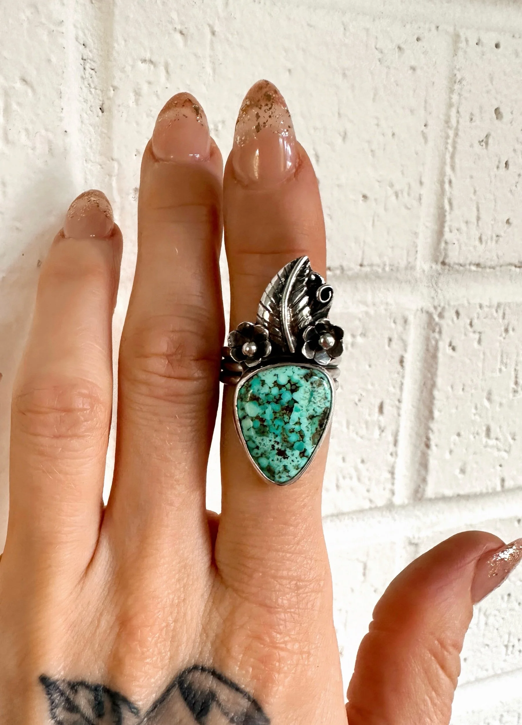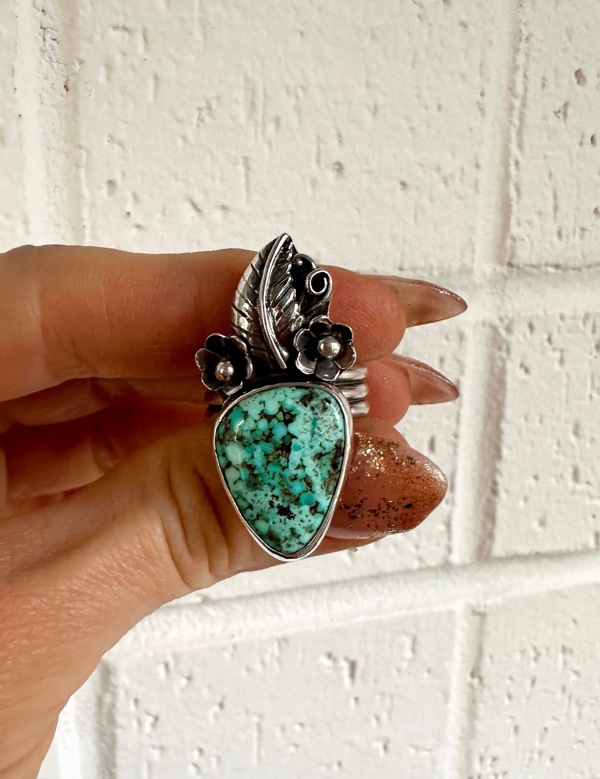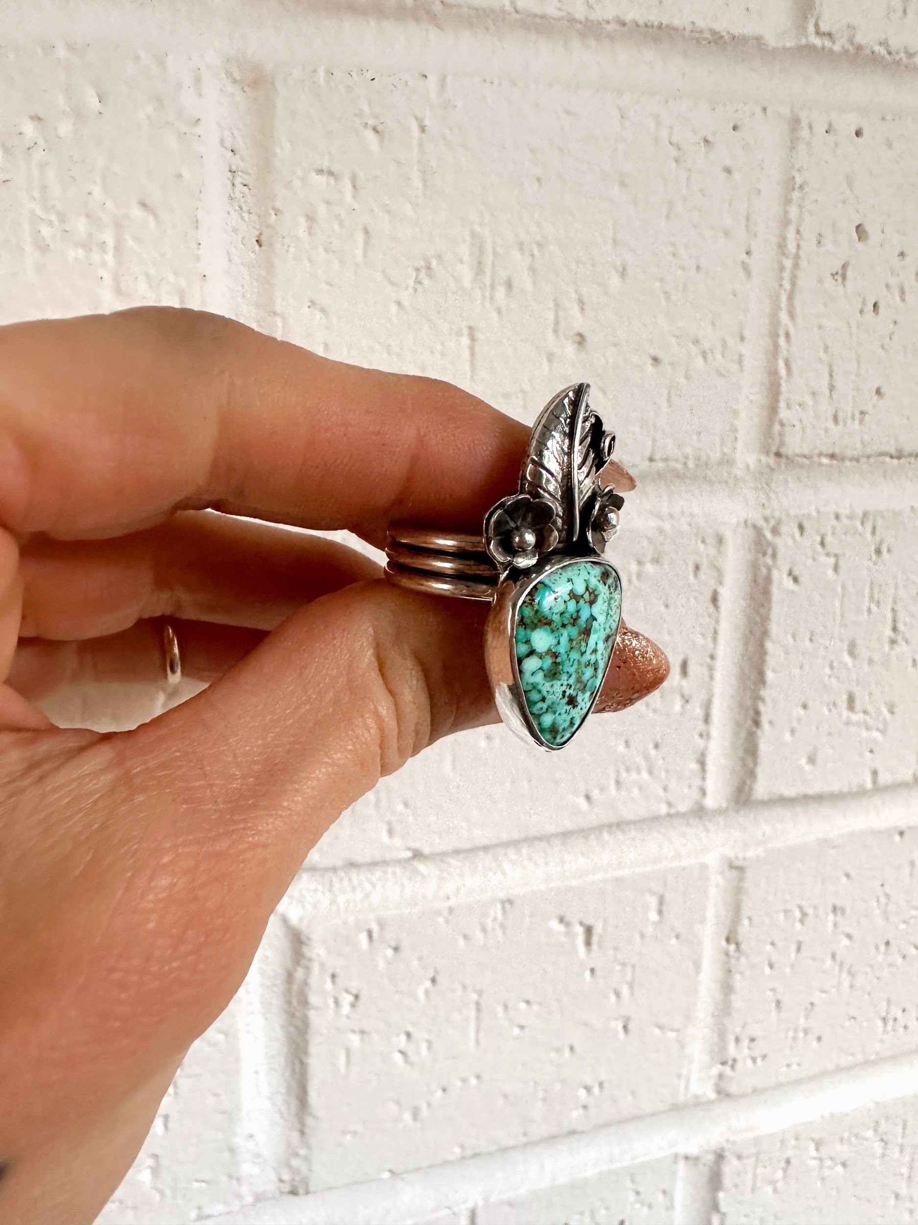 Image 1 of 5 Image 2 of 5 Image 3 of 5 Image 4 of 5 Image 5 of 5 Floral Crown Ring- SZ 8 $210.00 Sterling silver and white water turquoise Ring with silver floral crown detail. Size 8Handmade by Joelle Camino Add To Cart Added! Sterling silver and white water turquoise Ring with silver floral crown detail. Size 8Handmade by Joelle Camino